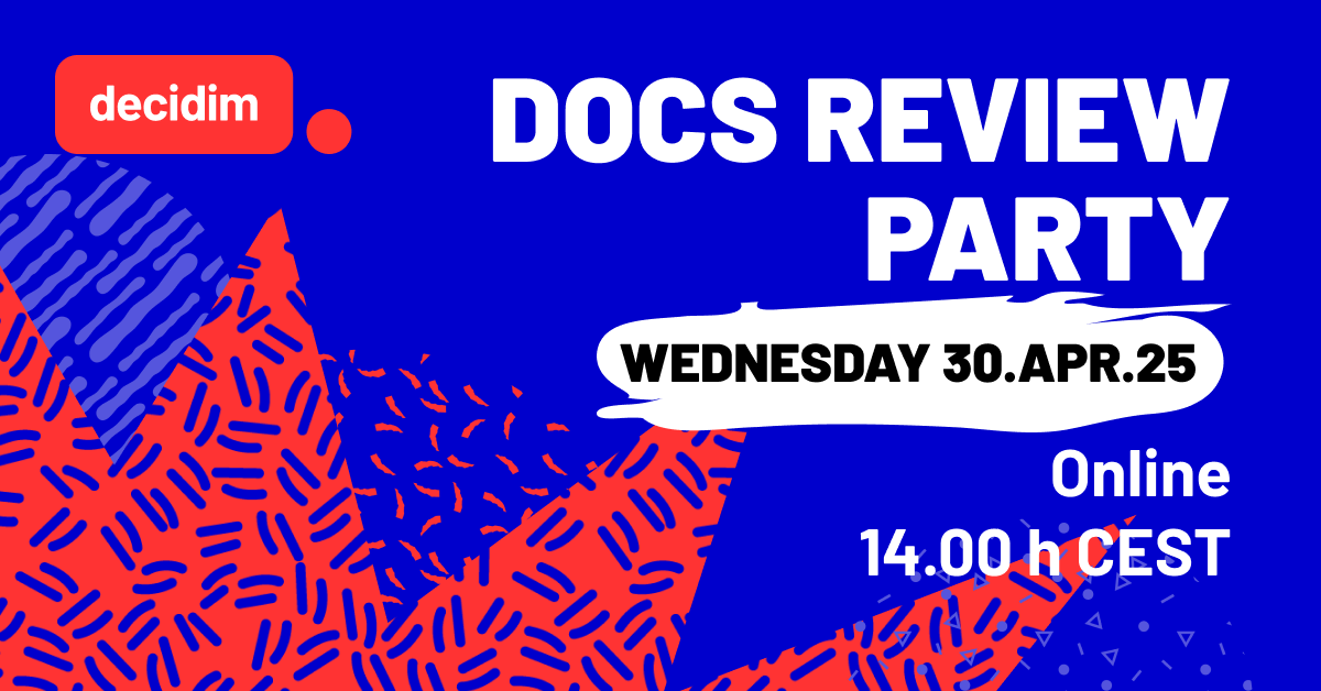 It's been a long road but we finally have the Decidim documentation updated with the latest version of the software, and now it's time for you to review it. We need your help and support to review the articles and information to ensure that the documentation is as clear and complete as possible. That is why we are organizing an online Docs Review Party on April 30 from 2pm to 4pm to collectively gather your input.