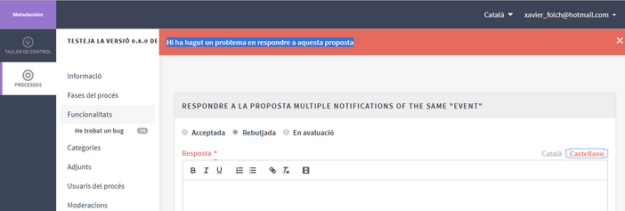Quina funcionalitat estaves provant? Respondre Bug (Proposta) desde el panell d'Admin de Metadecidim Què ha sortit malament? Es pot posar a l'estat Acceptada o En avaluació sense posar la traducció al castellà, en canvi no deixa posar l'estat Rebutjada sense posar la traducció al castellà; quan intentes respondre apareix el següent missatge: "Hi ha hagut un problema en respondre a aquesta proposta"
