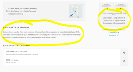 A la funcionalitat de "Trobades" es permet fer un tancament de la trobada inserint informació d'aquesta. El text de l'informe es mostra a la UI sense salts de línia. Les organitzacions que van participar a la trobada també es mostren sense salts de línia.