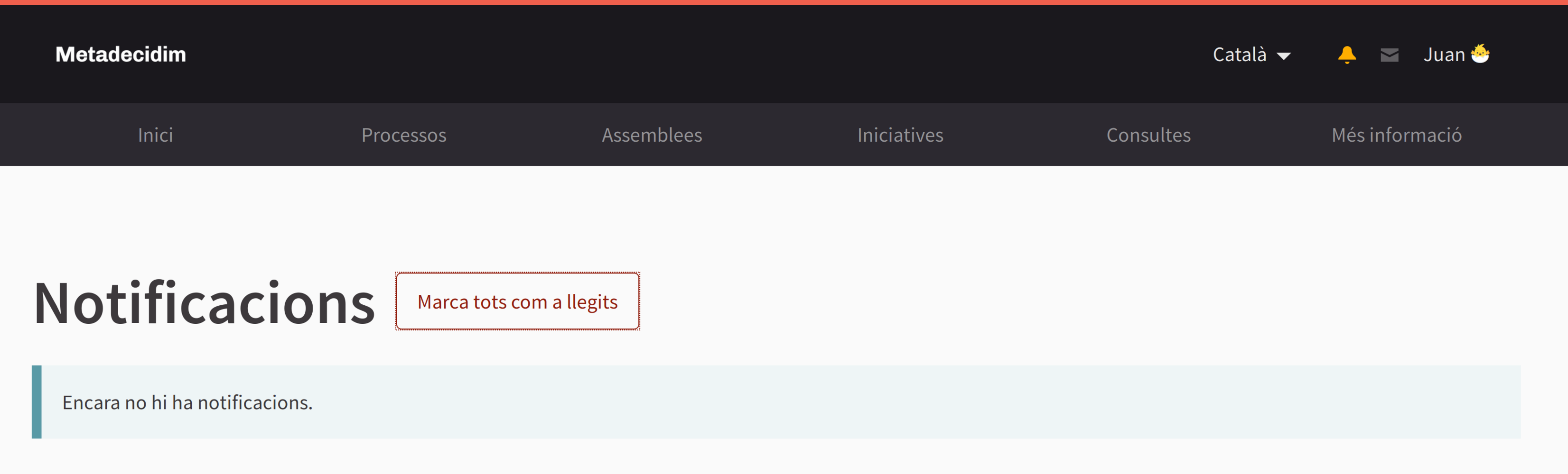 Al actualizar las notificaciones y marcarlas como "leidas", la campana de notificaciones sigue apareciendo en estado activo (color amarillo). Solo desaparece este estado y aparace inactivo al referscar la página. Debería actualizarse el color de forma inmediata al marcar todos los mensajes como leidos