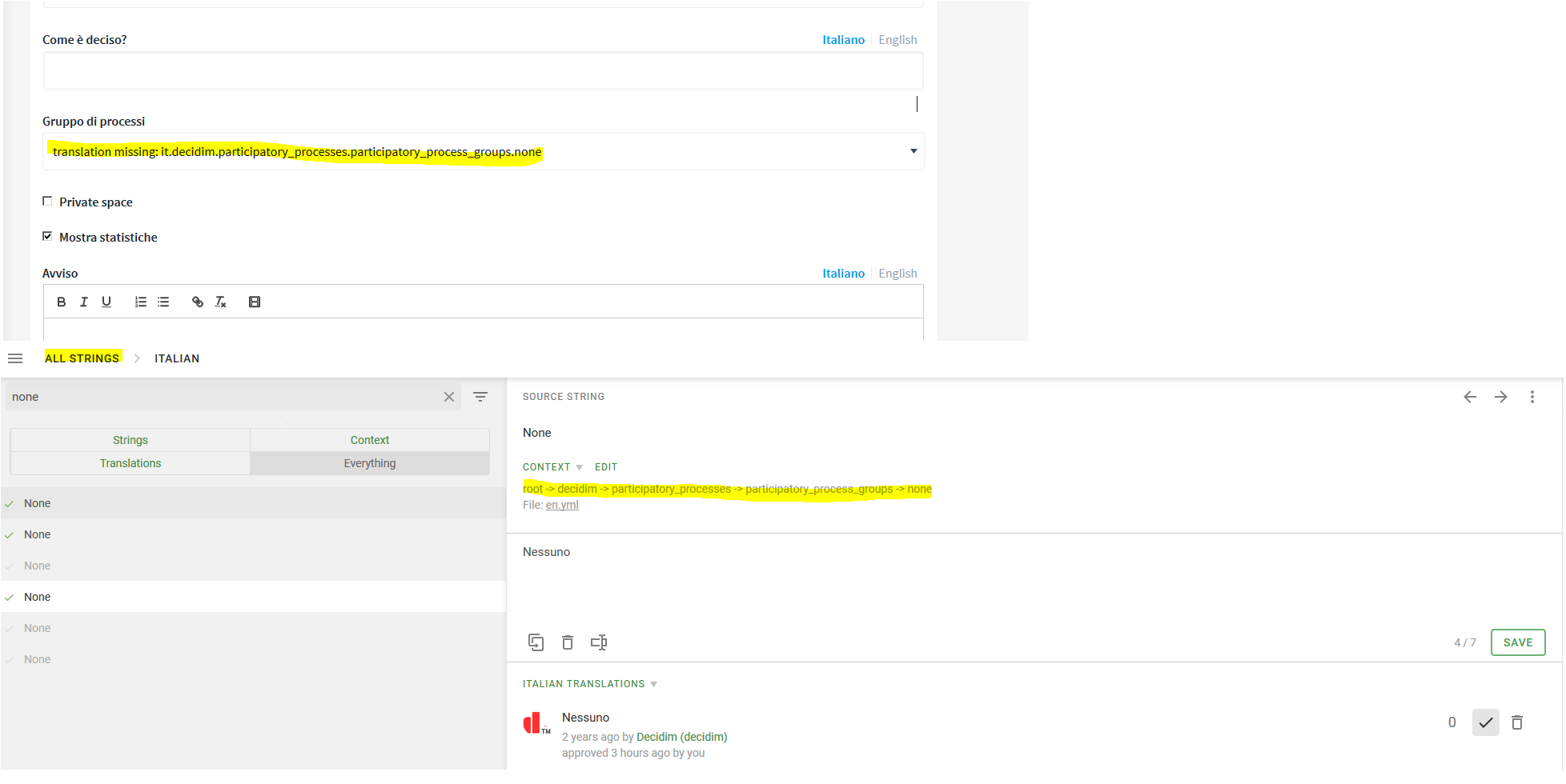 The string with this context root -> decidim -> participatory_processes -> participatory_process_groups -> none does not appear on the file partecipatory_processes/it.yml and is required. Crowdin shows the string, which is maybe inside another yml file (see screenshot), while the GUI shows an error for a missing translation (see screenshot). I don't see any other error of this type on the GUI. Please, take into account that we are importing locales manually copying ymls on the gems, check https://github.com/decidim/decidim/issues/5219