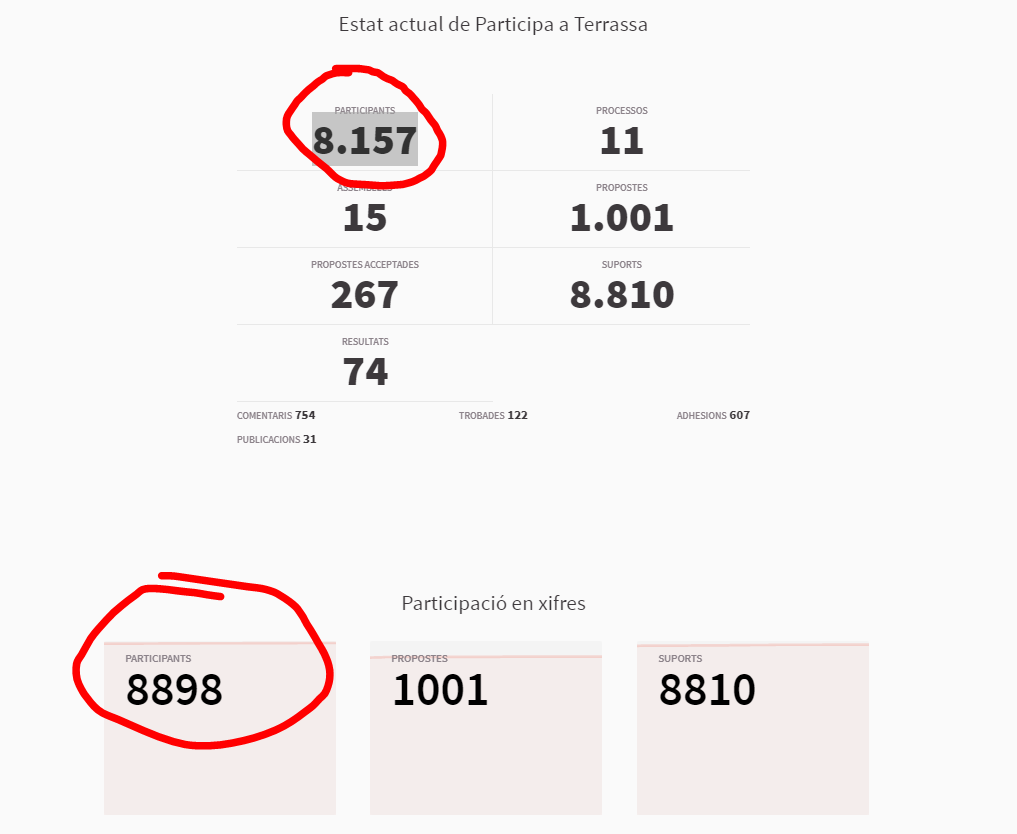 A la home, les xifres de "Estat actual de..." i les de "Participació en xifres", no coincideixen.