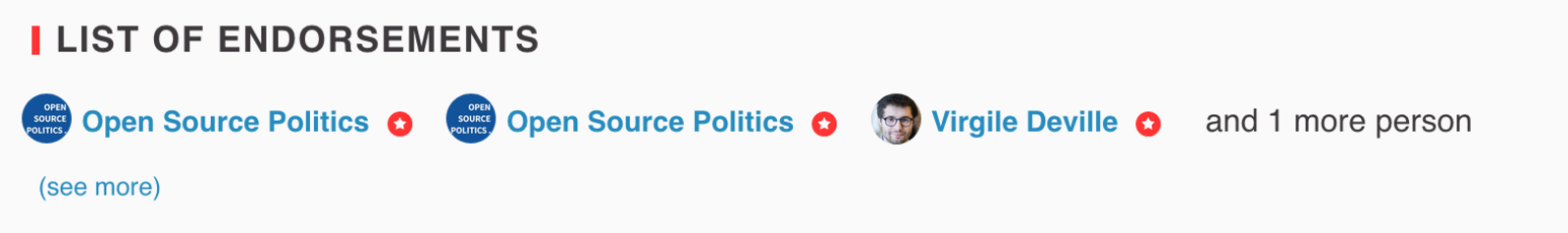 Hi everyone, 1. What went wrong? After endorsing a proposal on Metadecidim, @virgile_deville and I realized both of us had endorsed the same proposal, with both our personal accounts and on behalf of our user group, @OSP. 2. What did you expect to happen? When two users of the same organization endorse/vote for the same proposal on behalf of the group, I expect the platform to take into account one vote/endorsement only. 3. Where did you found this bug (which site)? On Metadecidim Thank you!
