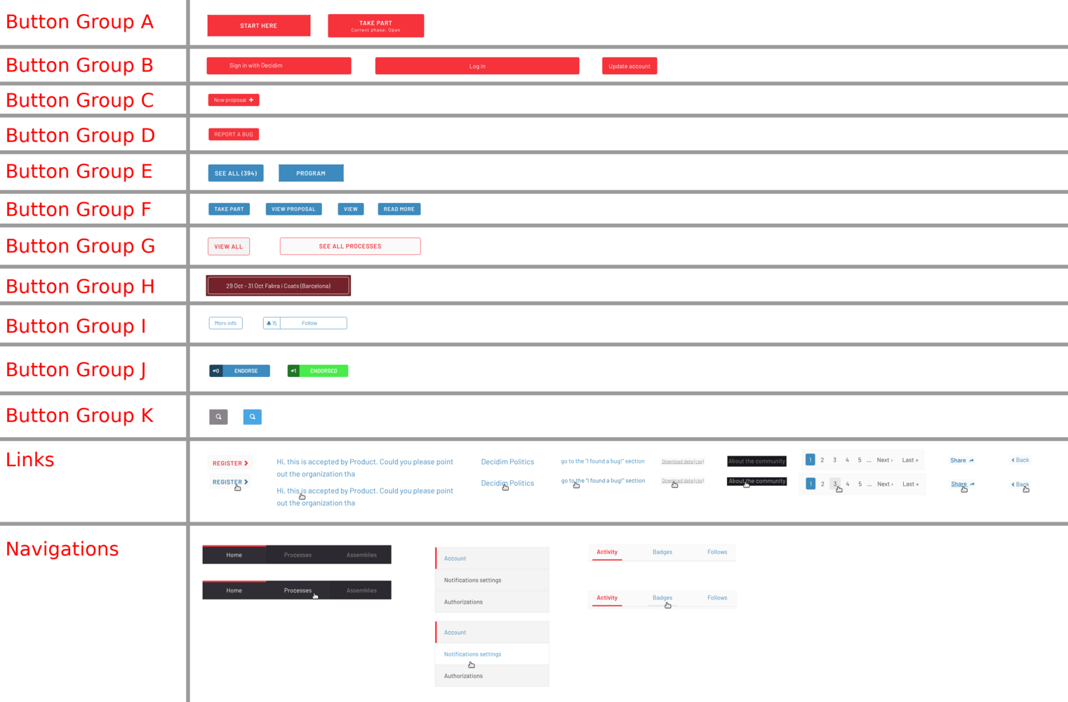 One important Decidim’s accessibility criteria violation concerns the navigational and functional link and button styling. In the attached screenshot I've gathered visually similar buttons into their own groups found on Metadecidim. The main problem is that we have at least 11 groups of different styles of buttons for a single application. According the the accessability experts, we should have the following styles for buttons: - Primary (e.g. Group A) - Secondary (e.g. Group G) Makes the UI clearer and more understandable as the user gets accustomed to the two simple styles of buttons. Other one can be one can be functional, e.g. publish a proposal (primary) and the other navigational switching from one view to another (secondary). Regarding the links, the accessibility experts suggest that: - All links should have the same styling - Links should not appear in grey color unless they are disabled