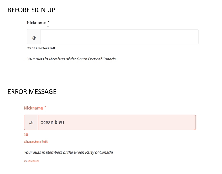 Neither the English-language text in the Sign Up form Nickname field, nor the error message explain tells them that they can't use spaces.