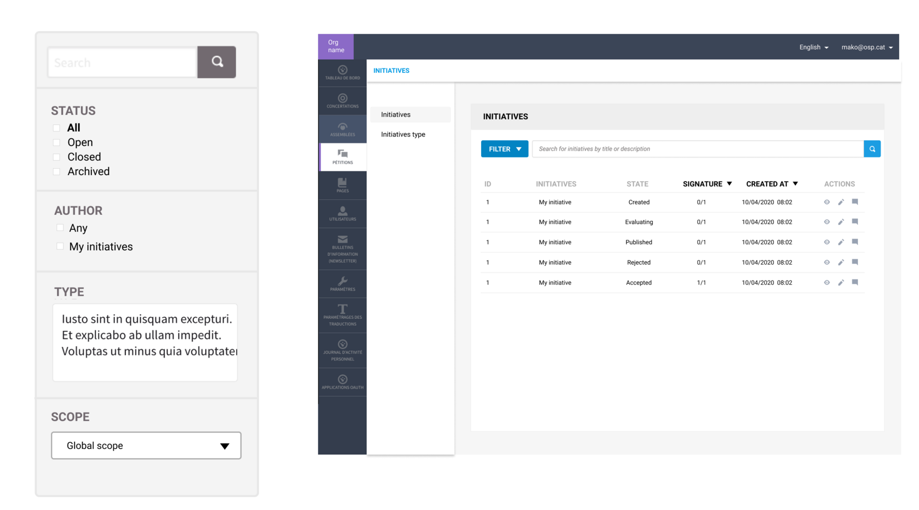 As a user, I want to be able to access to all initiatives on the same index by clicking on the filters I want.