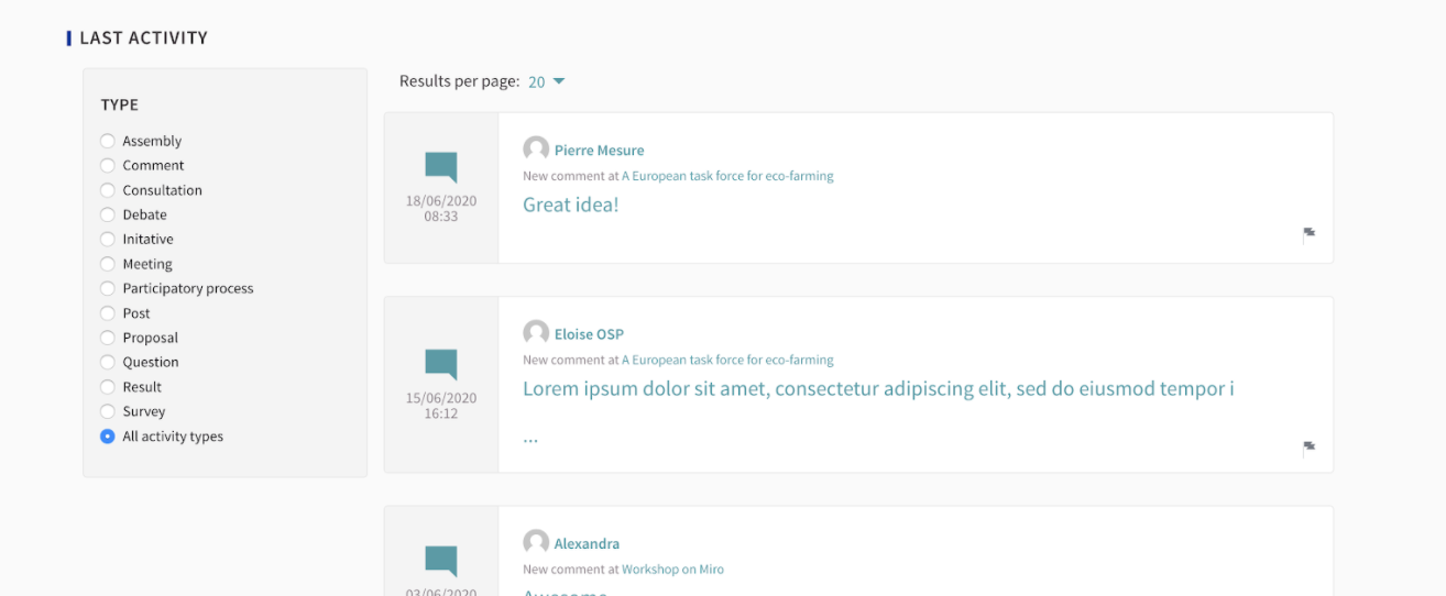 On the last activities section in homepage and on the /last_activities page, users can have an overview on newly created contents (proposals, comments, meetings). Unfortunately, the content cards does not display the “Report flag” and the user has to open each content page.