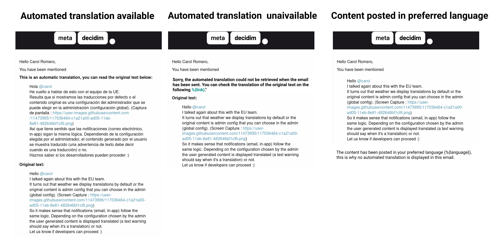 As a user, when machine translations are activated (Feature introduced in PR 6127 https://github.com/decidim/decidim/pull/6127 (External link)), I'd like to receive the machine translated version of the UGC (user generated contents : proposals, meetings, debates, comments) in the email notifications along with the original content to avoid any confusion.