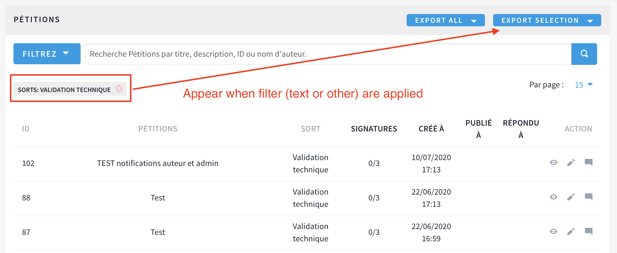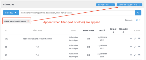 I'd like the exported csv to only include the current selection I made using the filters. This feature doesn't exist yet in Decidim, I'd love to get the communities suggestion on how to implement it technically.