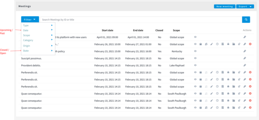 As an admin whenever there are many meetings in a component it becomes quite tedious to manage them as there are no filters, no sorting, no search box.