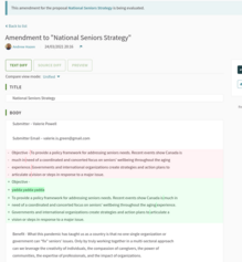 - Preview: This view shows the amendment as if it was a proposal, so the user can see how it looks. Currently there's no way to see an amendment as if it was accepted.