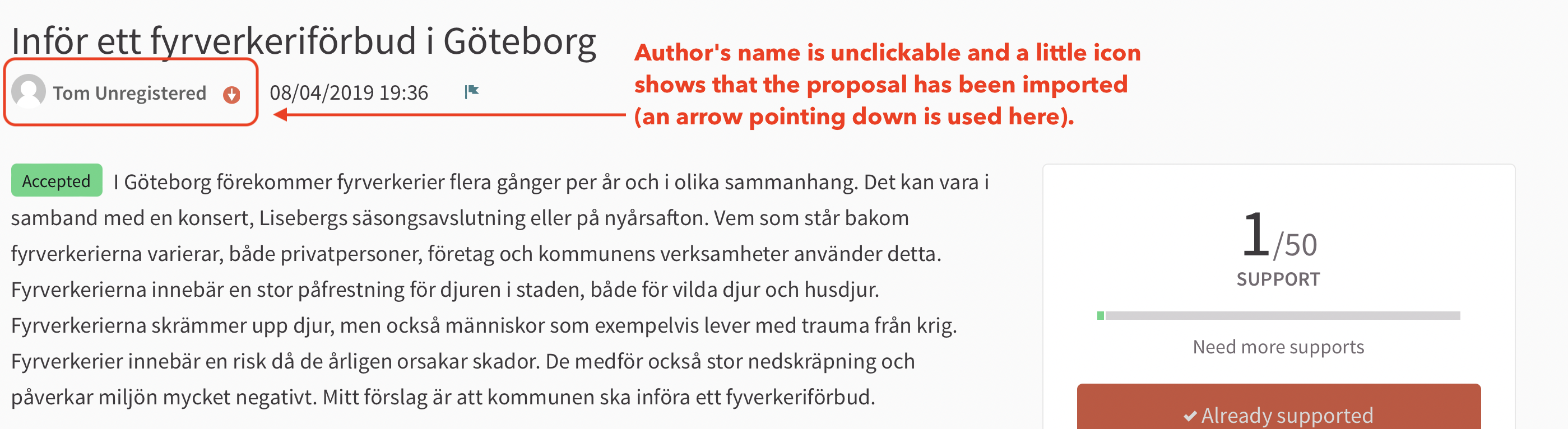 The former would then be shown everywhere as the proposal's author (on the proposal's card, proposal page, etc...). It wouldn't be clickable and a little icon could indicate that the author isn't on the platform or that the content was imported (see screenshots).