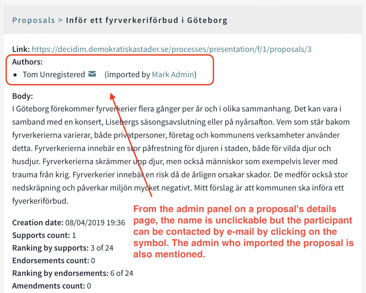 - For accountability purposes, all proposals imported should be logged in the admin log, and the name of the admin could be visible on the proposal page in the admin panel (see screenshot).