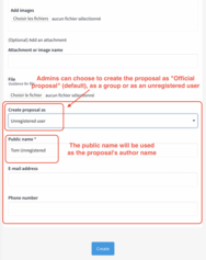 In the admin proposal creation form available from the admin panel, an option could be added to create the proposal as an unregistered participant.