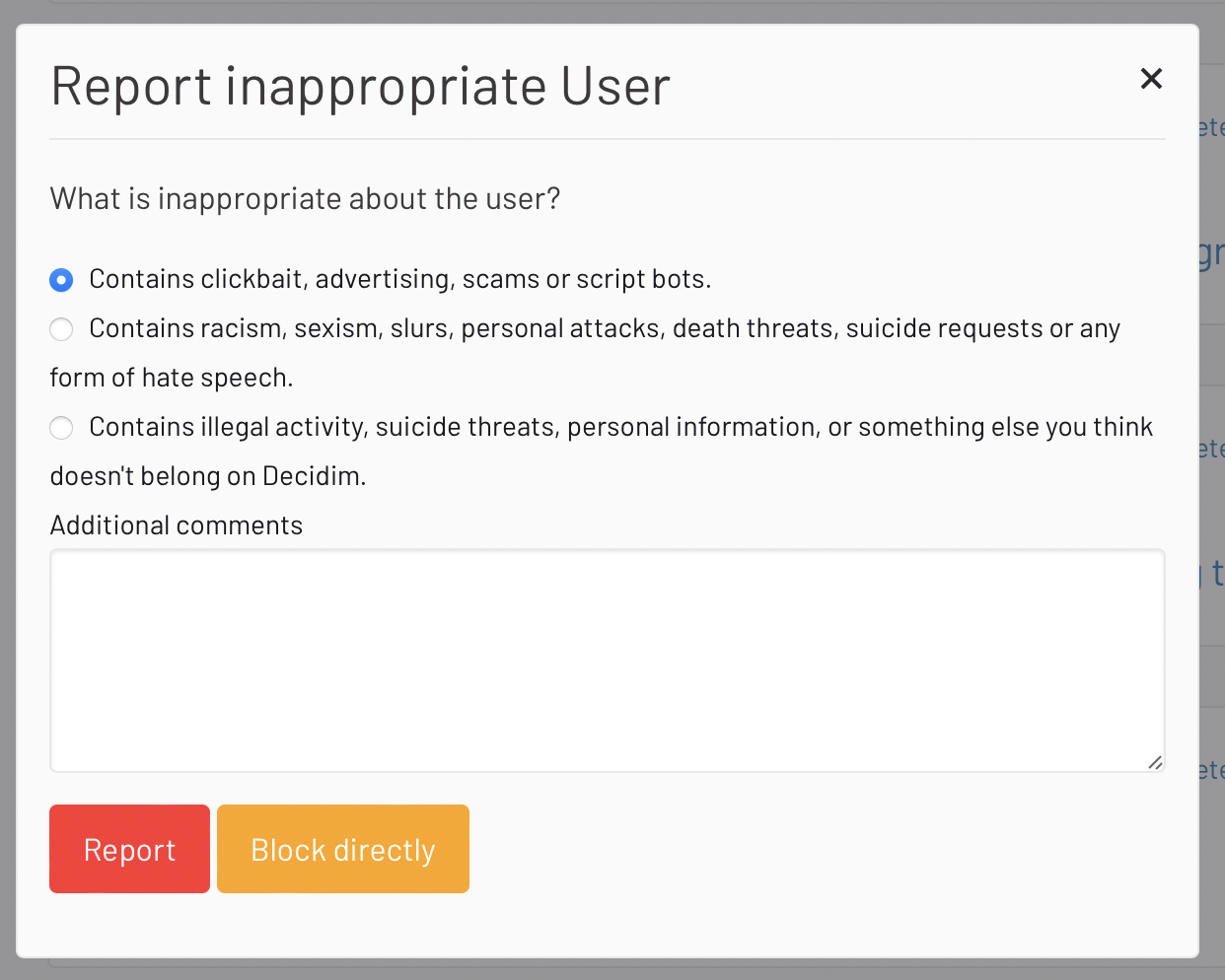 To make sure that the content is only moderated when it should, the buttons are included in the current workflow, they are visible on the popups opened by the flag buttons and the admin can still provide a reason. In the case of a user block, clicking on the orange button could take the admin to the page that asks for a motivation sentence.