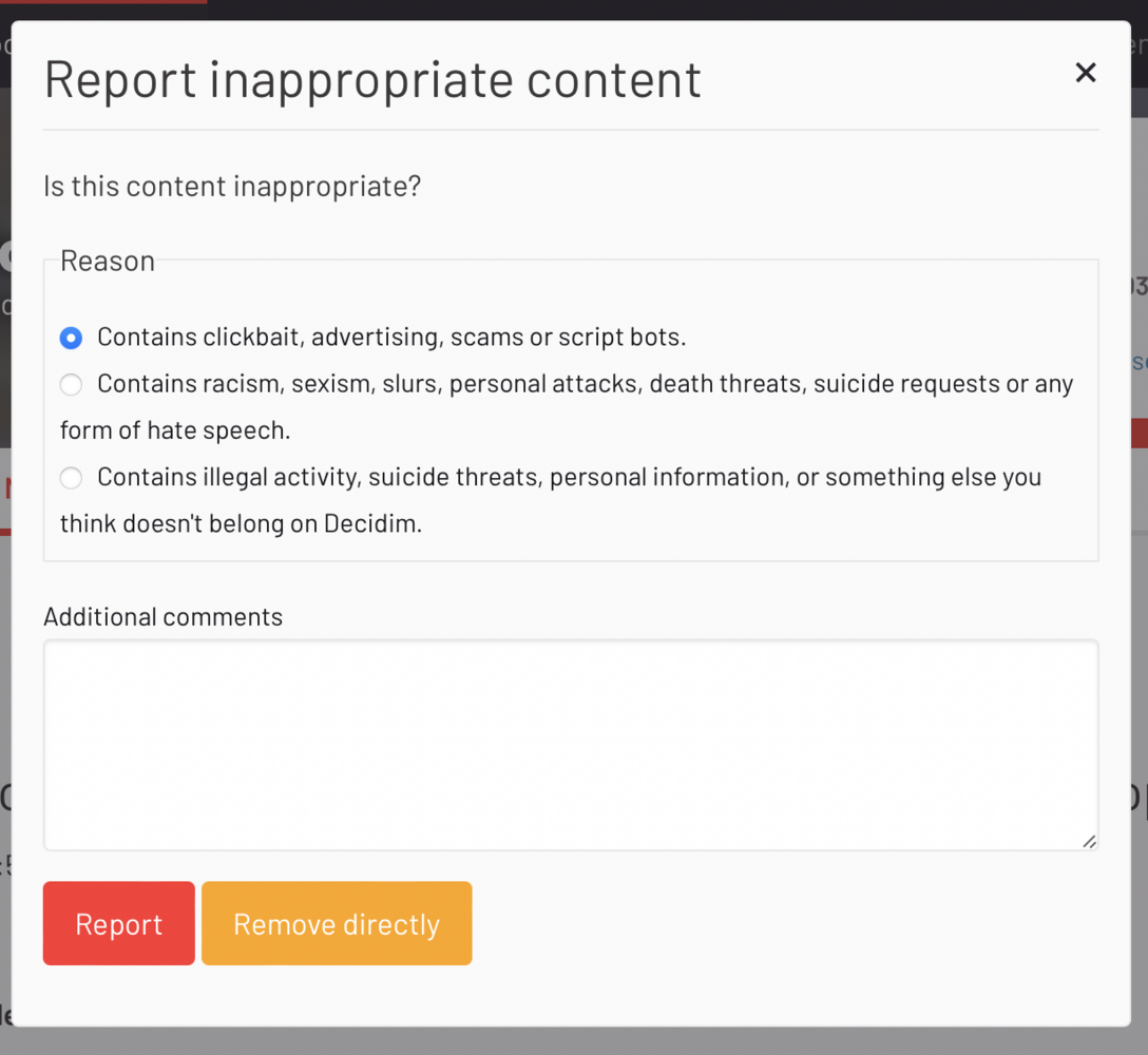 If an admin detects either while browsing the platform from the frontend, they have to report them using the flag button, just like any other participant. Then, they need to go to the moderation tab in the admin panel and hide/block from there.