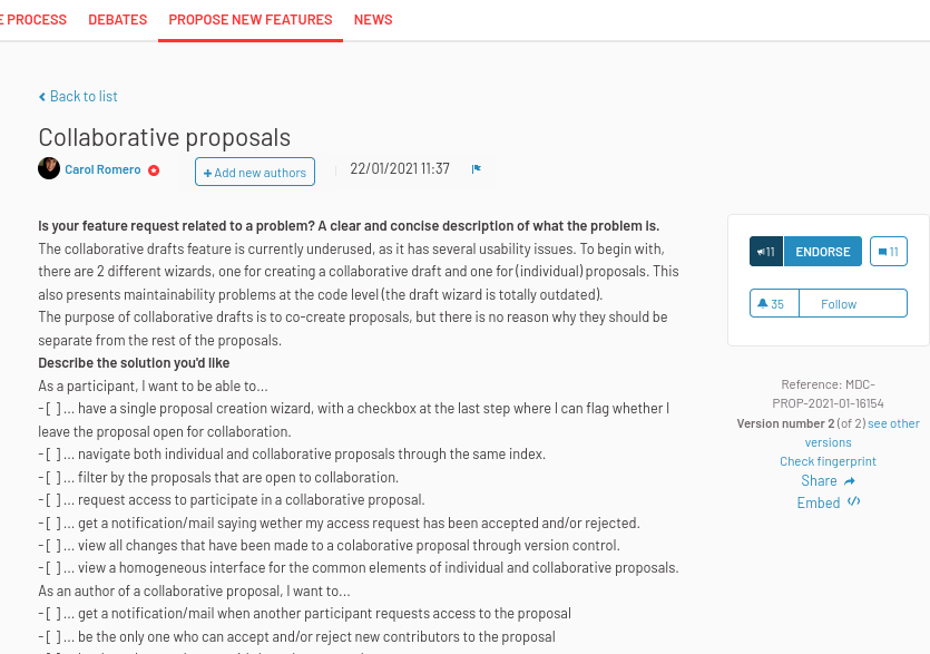 - When clicking in the “Add new authors” button, I’ll have a list of the commenters of this proposal, so the risk of people adding random participants or user groups is mitigated. I’ll be able to choose from these any number of authors. These authors will be shown in the proposal.