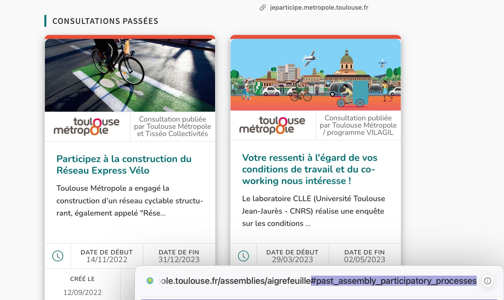We propose adding link anchors to various sections of the homepage and process pages on Decidim. These link anchors will allow users to quickly navigate to the section they are interested in, improving the overall user experience. This feature has already been successfully implemented for active and past processes in assemblies for Toulouse, demonstrating its feasibility and effectiveness.