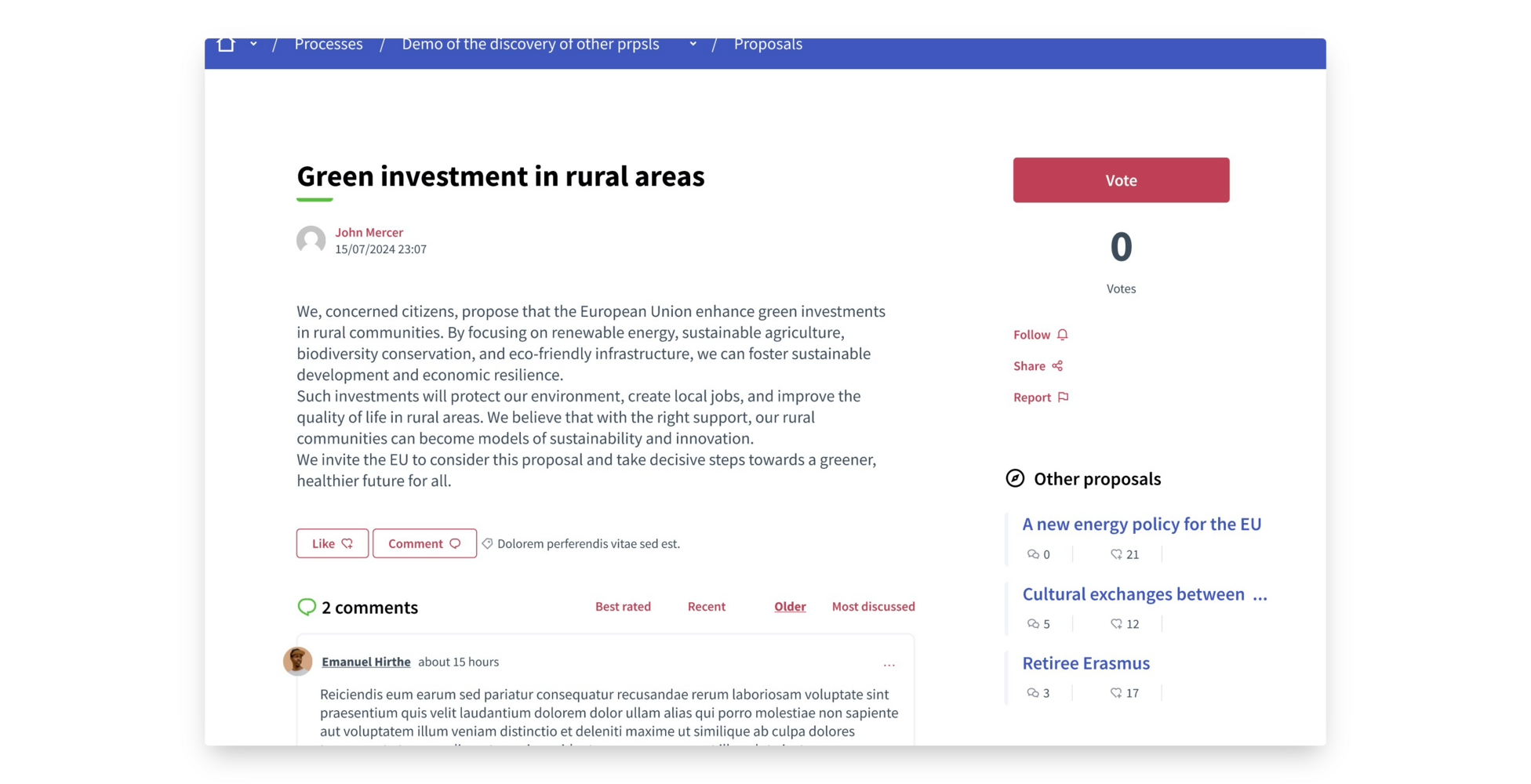 When someone views a proposal, it's a missed opportunity to keep them engaged by suggesting other relevant proposals. This kind of feature is common on many web platforms like YouTube's video suggestions or related articles in the media. If done ethically and in a balanced way (more on that below), it should greatly improve the experience. Especially as the concept of the drawer has been discarded.