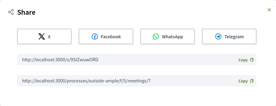 This functionality is already partially integrated into Decidim via #9383, which introduced short links, but its usage has been so far limited to exporting meetings. Extending this functionality to cover shared resources would streamline the user experience and enhance resource visibility across character-limited platforms.