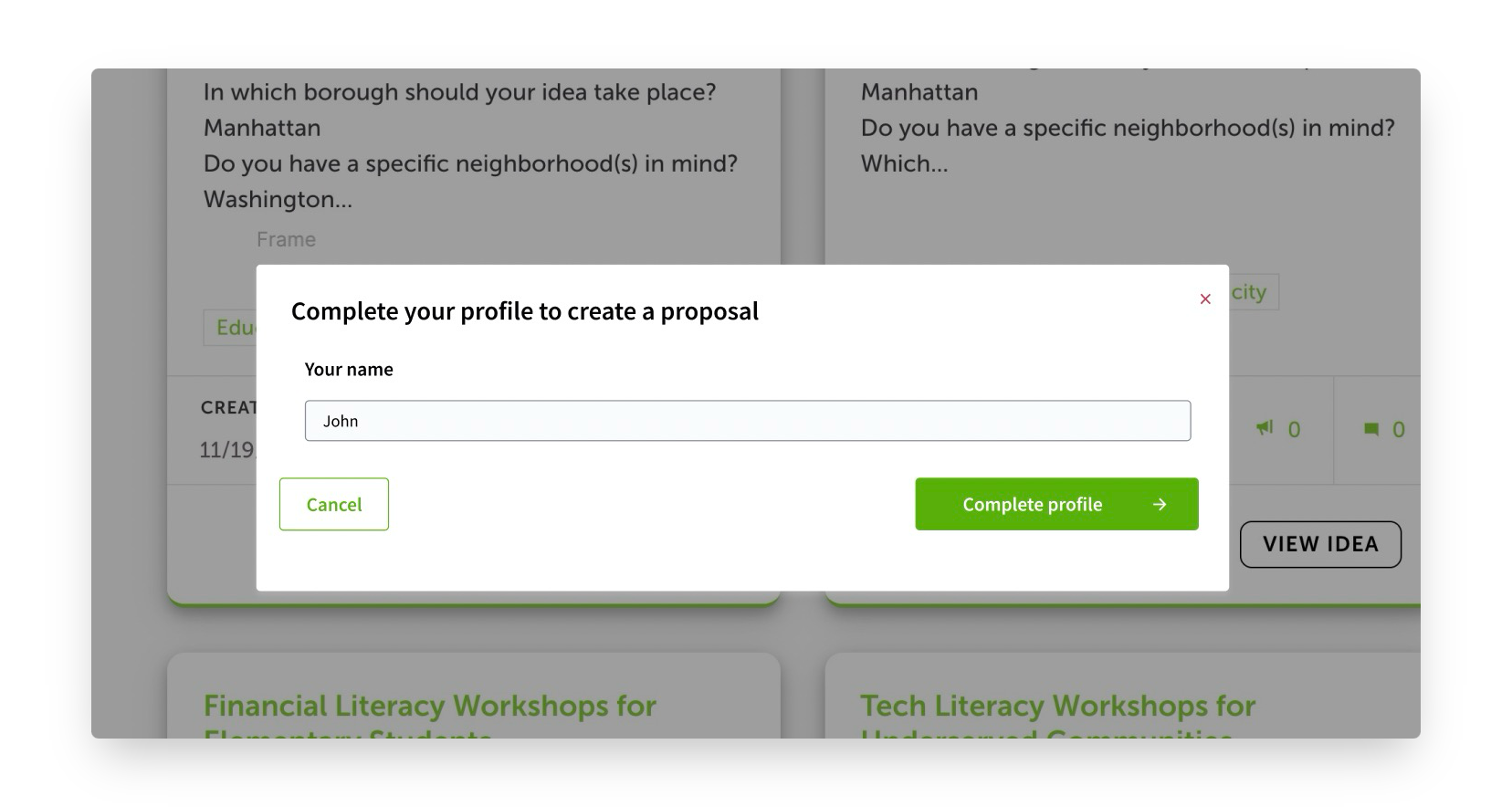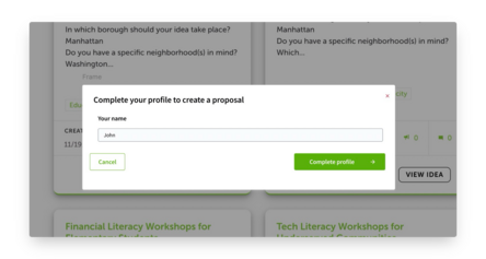 As an admin, you can choose not to ask for a user's name during signup. However, when a user wants to submit a proposal, you can set a rule that requires them to have a name in their profile. If a user without a name clicks 'Create proposal,' a popup will appear prompting them to add their name. Once they submit it, the name is saved for future use, and they can proceed with writing their proposal.